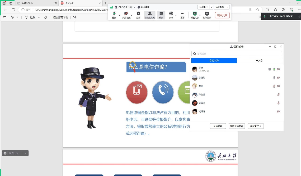 随后,在“守望生命”安全教育部分,老师们首先向大家强调离校必须请假,如因出差、联培、延毕、考试等原因需离校,必须找辅导员办理请假手续,安全第一位。紧接着从防盗、消防、维护国家安全、校园内部交通、防外部滋扰以及网络安全六个方面入手,通过讲案例、看视频,提醒学生吸取经验教训,牢记辅导员、班主任及校园报警求助电话,遇到任何安全问题应及时与老师、学校联系,时刻注意保护自身安全。