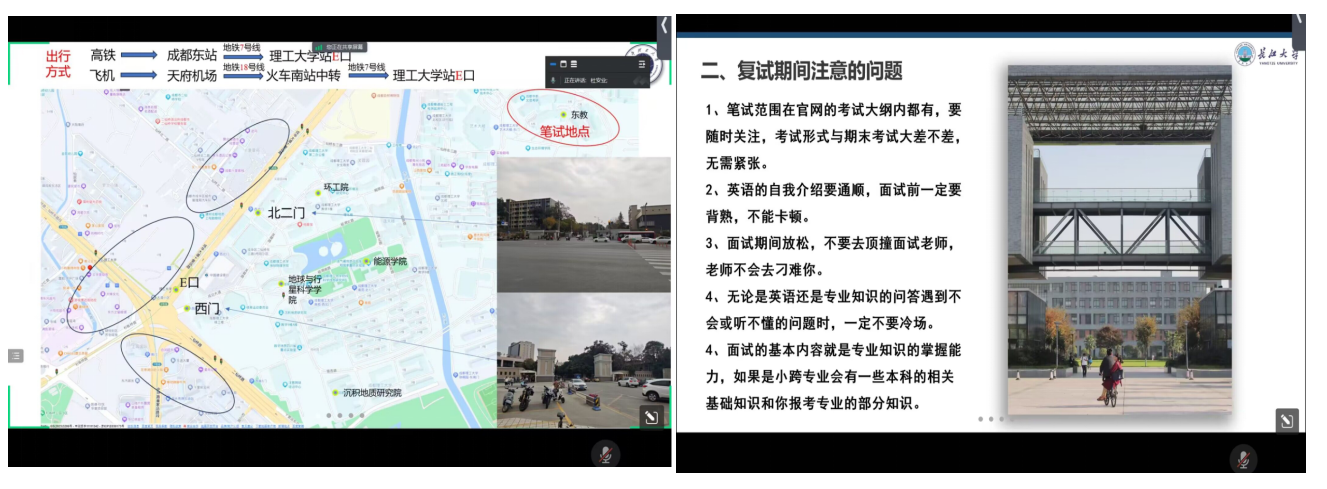 陈雅琦同学介绍了中国地质大学(武汉)GIS中心的复试流程,包括面试、笔试、上机环节,提醒大家要制定合理的复习计划,保证基础知识的全面掌握,熟悉软件操作步骤、多做模拟题。还以一位同学的简历作为例子进行了“手把手”的修改指导,帮助大家明白简历该如何突出亮点,展现优势。刘汀同学针对手标本鉴定、地震剖面图识别、卫星图像识别地质现象等实验考核环节,提醒大家考前多观察多练习。两位同学还就是否需要提前联系导师等问题给出了自己的经验和建议。