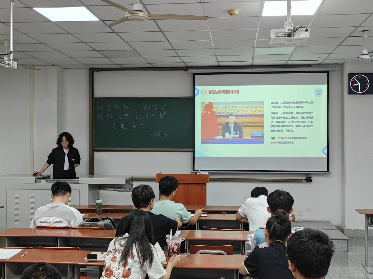 首先,班主任们介绍了“碳达峰、碳中和”的相关概念及提出背景。近年来,随着各国二氧化碳排放,温室气体猛增,人类面临着气候快速变暖的全球性问题,对生命系统形成威胁。在这一背景下,我国以习近平同志为核心的党中央统筹国内国际两个大局提出碳达峰和碳中和的重大战略决策。接着,老师们向大家宣传绿色低碳引领行动、生活垃圾分类、反对食品浪费、绿色校园创建等内容,并倡导同学们将低碳、环保等理念应用到日常生活中去。同学们纷纷表示保护环境,人人有责,将从身边的小事做起,从我做起,充分发挥好新时代大学生在落实“双碳“行动,共建美丽家园”上的先锋模范带头作用,尽力做到保护好地球,守护好我们的家园。