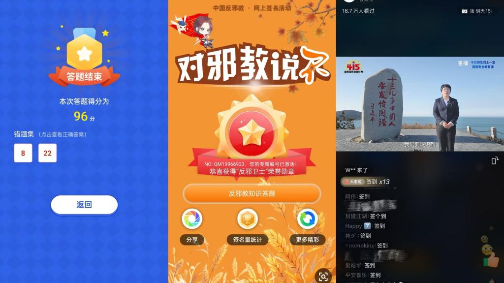 直播观看完毕后,西瓜视频 各班纷纷开展了国家安全主题班会。在班会上,各年级辅导员、班主任老师与同学们一起观看了“反邪教警示教育进校园”视频。同学们围绕“日常生活中如何维护国家安全与防范邪教”展开讨论,并纷纷在“中国反邪教”公众号上进行网上签名,积极参与“全国大学生国家安全知识答题”活动,增强了同学们国家安全责任意识和社会责任感。