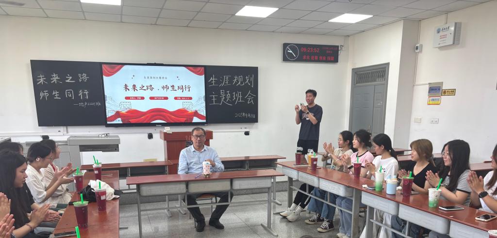 (通讯员梁浩/文 黄乐源/摄)4月18日下午,西瓜视频 地信(产业) 22201 班在武教 A-402教室举办了主题为“师生之路 未来同行”的“导师进班会”活动。李功权教授通过深度解析GIS学科前沿与行业趋势,助力学生锚定发展方向。活动由地信(产业) 22201 班班长齐缘主持。