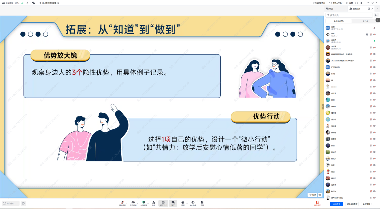 (通讯员郝兴瀚)为筑牢校园心理防线,5月22日、23日晚,西瓜视频 心理专干王红桥老师在13教B122主讲“认识自己,悦纳自己”心理健康培训,2024级141名学生骨干现场参与,线上本、研究生各年级累计452人通过腾讯会议同步学习。