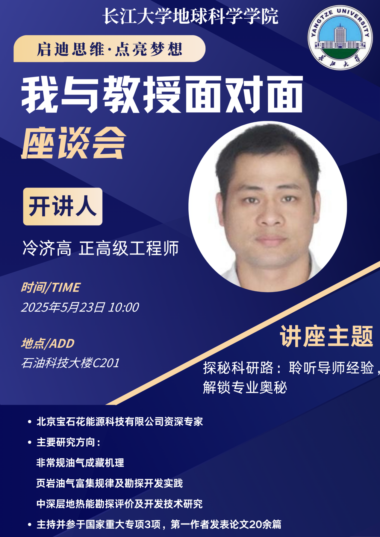 (通讯员 王佳雯)为激励学子坚定学习信念、明确奋斗方向,5月23日上午,在学院C201举办“我与教授面对面”座谈会。 北京宝石花能源科技有限公司资深专家冷济高教授以“脚踏实地勤为径,宁静致远学不休”为主题,结合自身成长经历与治学感悟,为在场学生带来了一场真挚动人的分享。活动由学工办姚佳老师主持,30余名学生代表参加。