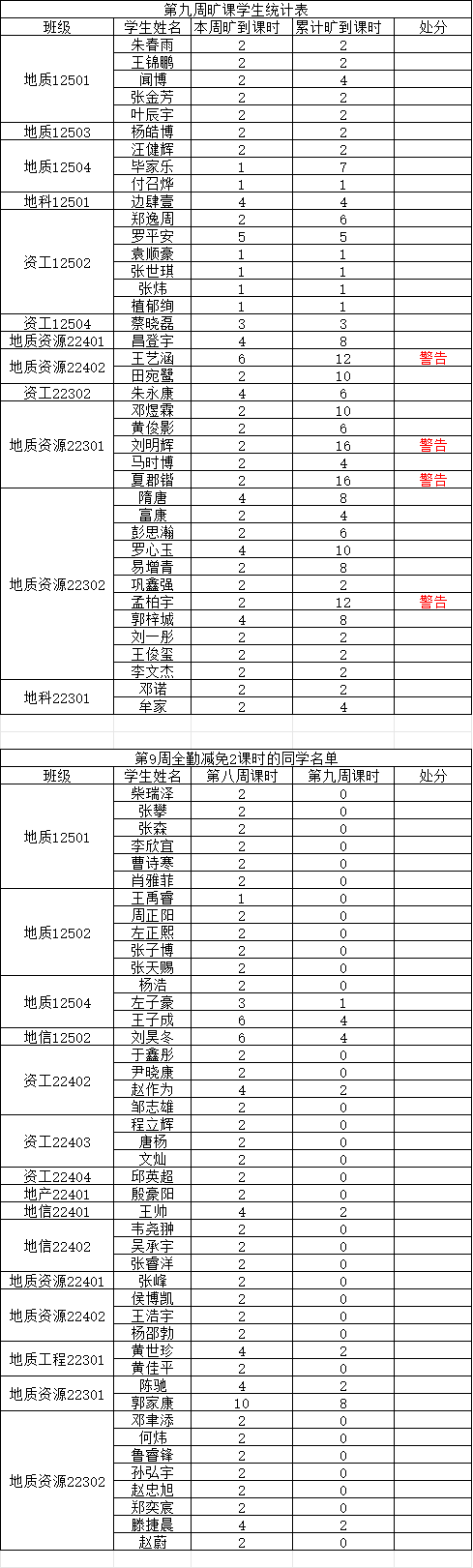 关于第九周课堂考勤的通报 为落实学院关于加强学风建设的相关要求,进一步规范课堂秩序,营造良好的学习氛围,西瓜视频 持续开展常态化课堂考勤工作。现将第九周考勤情况通报如下: 一、旷课学生名单 二、相关说明 依据《积极分子动态管理办法》第五章,积极分子考察期内无故旷课取消身份。 依据《西瓜视频 学生违纪处分办法》,一学期累计旷课达到规定学时的,分别给予以下处分: 1. 旷课达到12学时,给予警告处分; 2. 旷课达到24学时,给予严重警告处分; 3. 旷课达到36学时,给予留校察看处分; 4. 旷课达到48学时,给予留校察看处分; 5. 旷课达到60学时,给予开除学籍处分。 注:若学生某周存在旷课记录,但次周所有课程均正常到课(无迟到、旷课),则可从该生累计旷课课时中减免 2学时。