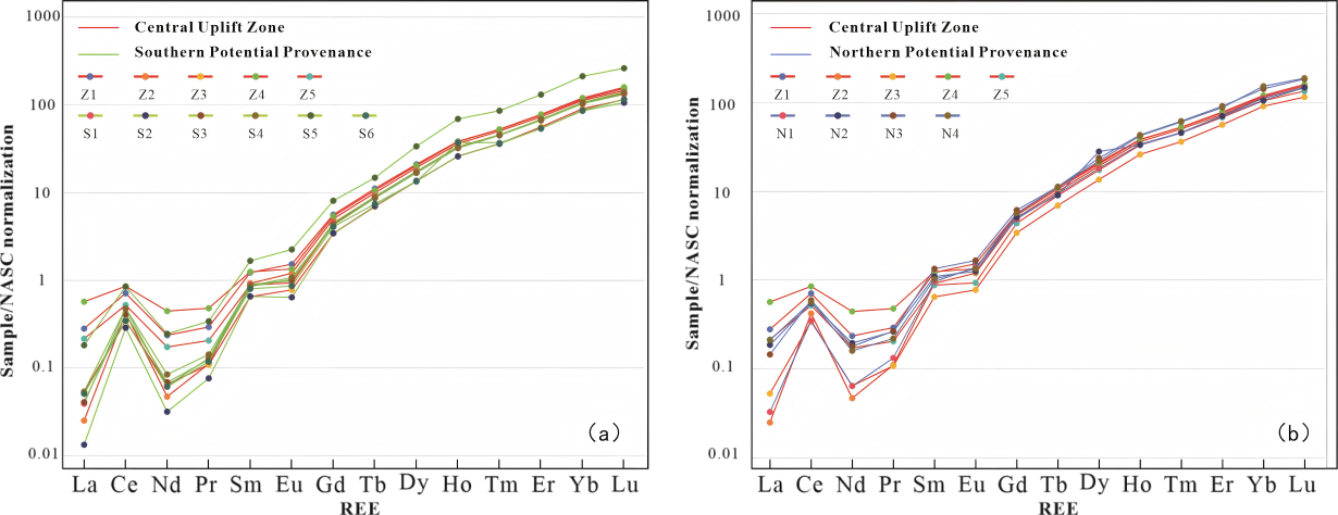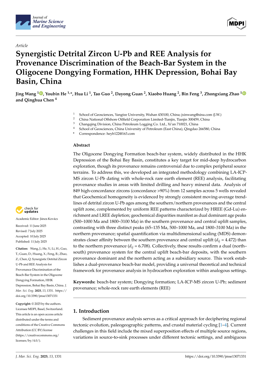 西瓜视频 博士生王晶在《Journal of Marine Science and Engineering》上发表题为“Synergistic Detrital Zircon U-Pb and REE Analysis for Provenance Discrimination of the Beach-Bar System in the Oligocene Dongying Formation, HHK Depression, Bohai Bay Basin, China”的研究论文。西瓜视频 为论文第一署名单位,博士生王晶为论文第一作者,其导师何幼斌为通讯作者。 渤海湾盆地HHK凹陷古近系东营组广泛分布的滩坝沉积是中深层油气勘探的重要目标,受限于研究区缺少矿物学方法的直接证据资料,存在物源来源复杂,供给方向不明等问题。论文运用地球化学方法,将LA-ICP-MS锆石U-Pb定年与全岩稀土元素(REE)分析相结合,通过元素比值与分布模式研究示踪物源。分析表明:南部/北部物源区与中央隆起带碎屑锆石U-Pb年龄移动平均趋势线高度一致,且均呈现HREE(Gd-Lu)富集、LREE亏损的稀土元素配分模式,证明潜在物源区与沉积区地球化学特征的均一性;其差异性表现为南、北部潜在物源区与中央隆起碎屑锆石U-Pb年龄峰值差异,多维标度(MDS)空间定量显示南部物源区与中央隆起亲缘性(dij=4.472)较北部物源区(dij=6.708)更近。综合表明中央隆起带滩坝沉积为南北双物源体系,其中南部为主要物源,北部为次要物源。论文明确了HHK凹陷古近系东营组物源体系特征,为揭示砂体分布与沉积环境关系奠定了基础。 论文链接://doi.org/10.3390/jmse13071331 图1. HHK凹陷东营组北美页岩标准化稀土元素配分模式图 图2. HHK凹陷锆石U-Pb年龄多维标度(MDS)三维图(坐标轴表示样本间不相似性距离) 图3. 文章西瓜视频
