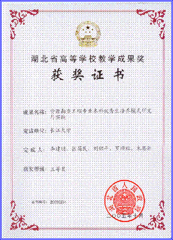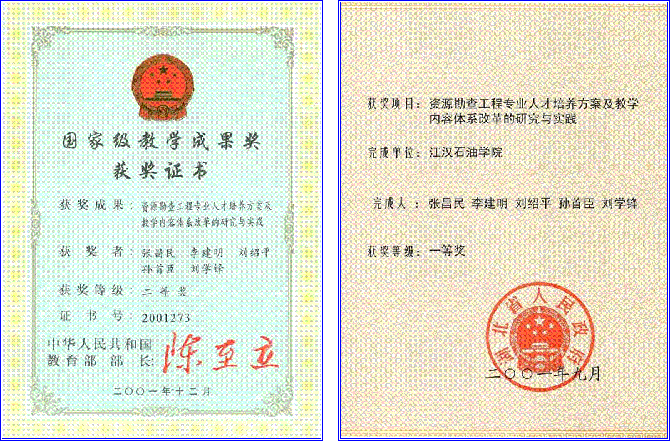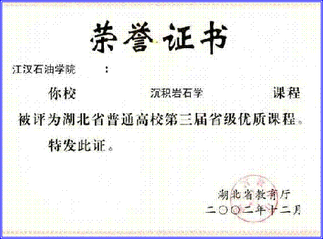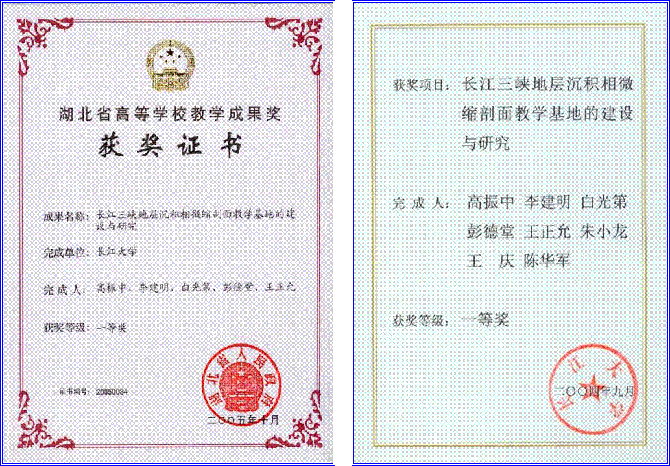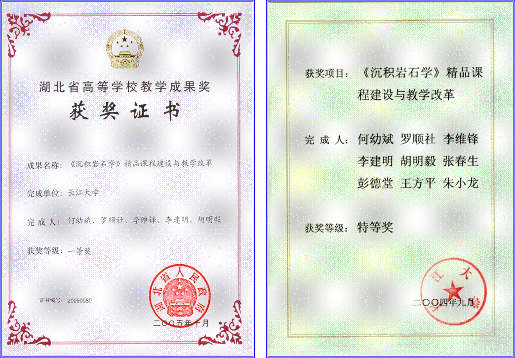 | 近五年来,课程建设小组教师积极开展教学研究,不断改革教学方法,提高教学质量。先后有 7 人次获得校级教学质量优秀奖, 1 人次获得系级教学质量优秀奖。 2001年,“资源勘查工程专业人才培养方案及教学内容体系改革的研究与实践”获国家级高等教育教学成果二等奖。 2002年,《沉积岩石学》被评为湖北省普通高校第三届省级优质课程,2003年被评为省级精品课程。 2004年,“资源勘查专业本科优秀生培养模式研究与实践”获西瓜视频 教学成果一等奖,2005 年获省级三等奖。 2004年,“沉积岩石学精品课程建设与教学改革”获西瓜视频 教学成果特等奖,2005 年获省级一等奖。 2004年,“长江三峡地层沉积相微缩剖面教学基地建设与研究”获西瓜视频 教学成果一等奖,2005 年获省级一等奖。