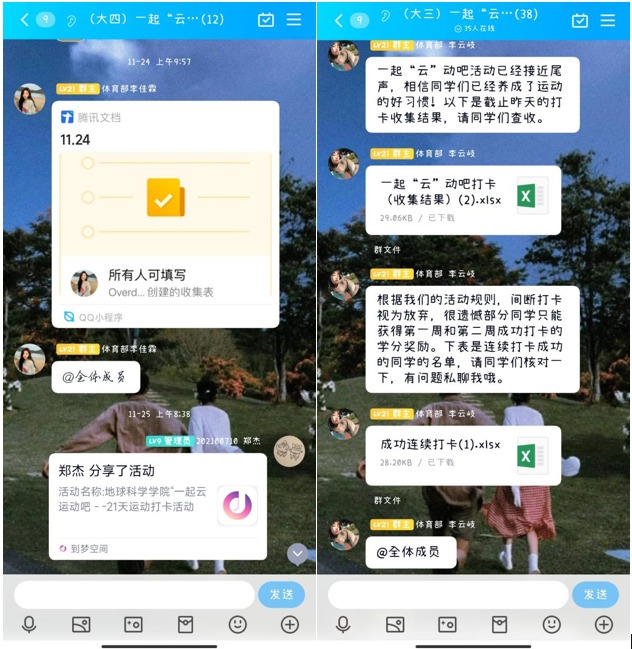大家每天在活动QQ群内晒出自己的运动照片、视频、运动APP截图等,交流运动心得,分享健康运动方式,大家互相监督、互相鼓励,增强了每日运动的主动性和积极性。打卡群内日日消息不断,各式各样的运动照片展现了大家热爱生活、健康向上的精神风貌和青春活力。学院对打满21天的同学准备了精品奖品,打卡天数累计14以上的同学均有第二课堂学分奖励。