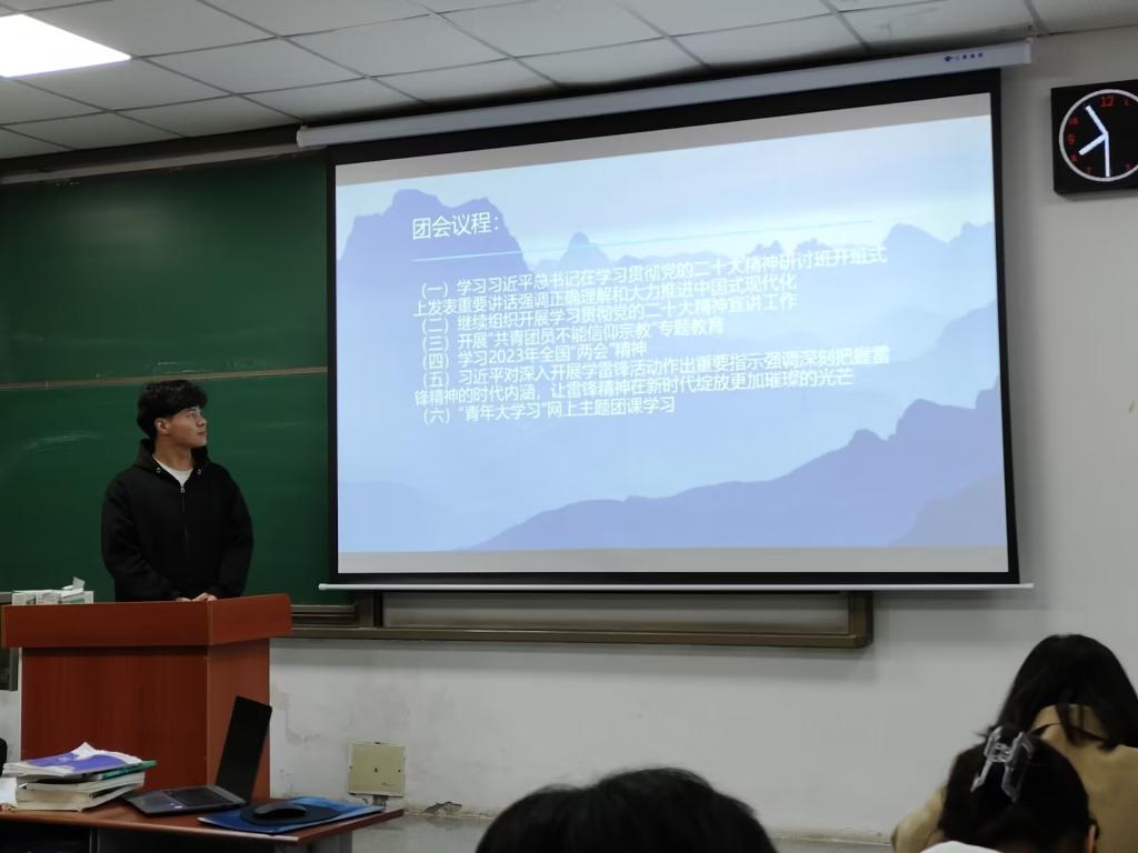 会议伊始,黎永鑫同学介绍了本次团会议程。接着带领同学们学习习近平总书记在学习贯彻党的二十大精神研讨班开班式上发表重要讲话强调正确理解和大力推进中国式现代化,继续组织开展学习贯彻党的二十大精神宣讲工作,然后开展“共青团员不能信仰宗教”专题教育,并且学习了2023年全国“两会”精神和习近平对深入开展学雷锋活动作出重要指示强调深刻把握雷锋精神的时代内涵,让雷锋精神在新时代绽放更加璀璨的光芒,最后强调了“青年大学习”网上主题团课学习的重要性。