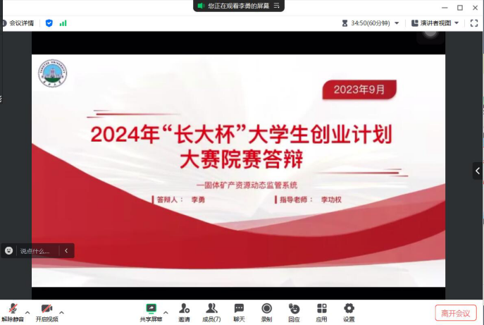 通过腾讯会议的方式举行2024年“长大杯”大学生创业计划大赛院内选拔赛,高达、张方利和尚成三位老师担任评委,分团委书记郭霖老师参会。