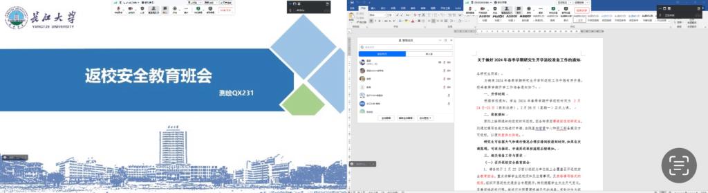 学生事务办公室接到校党委学生工作部工作要求后,于2月20至22日组织全体研究生参加以班级为单位,通过腾讯会议等平台召开的2024年春季学期返校安全教育班会,会议由各班班长主持。