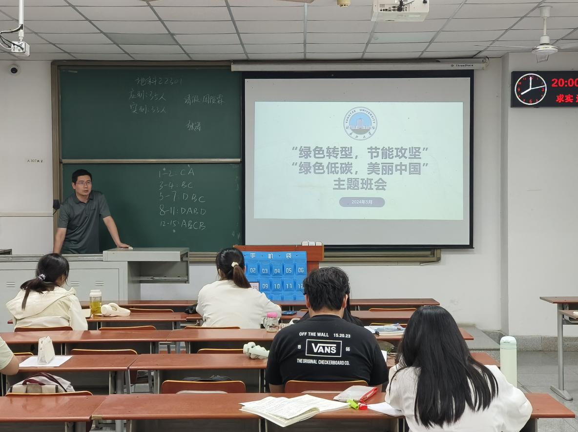 于5月13日至19日组织各班级开展以“绿色转型,节能攻坚,绿色低碳,美丽中国。”为主题的教育班会,会议由班主任主持。