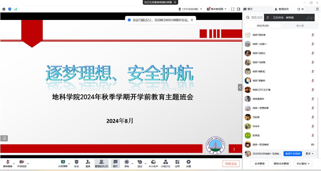 此外,老师们还强调文明上网、关注个人心理健康、注意返校时间节点以及配合班长完成暑期校行程收集工作等。本次主题班会结束后,学院学工办会将学生返校信息同步到家长群、班主任群及导师群,以发挥学校、家庭协同育人作用,确保全院学生顺利步入新的学期。