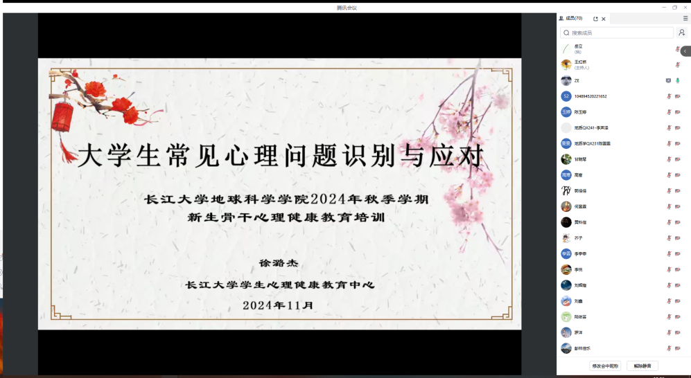 特邀心理健康中心徐潞杰老师主讲新生心理骨干教育培训,东校区135名本科生在12教104,武汉校区70名研究生心理骨干通过腾讯会议,共同参与学习。