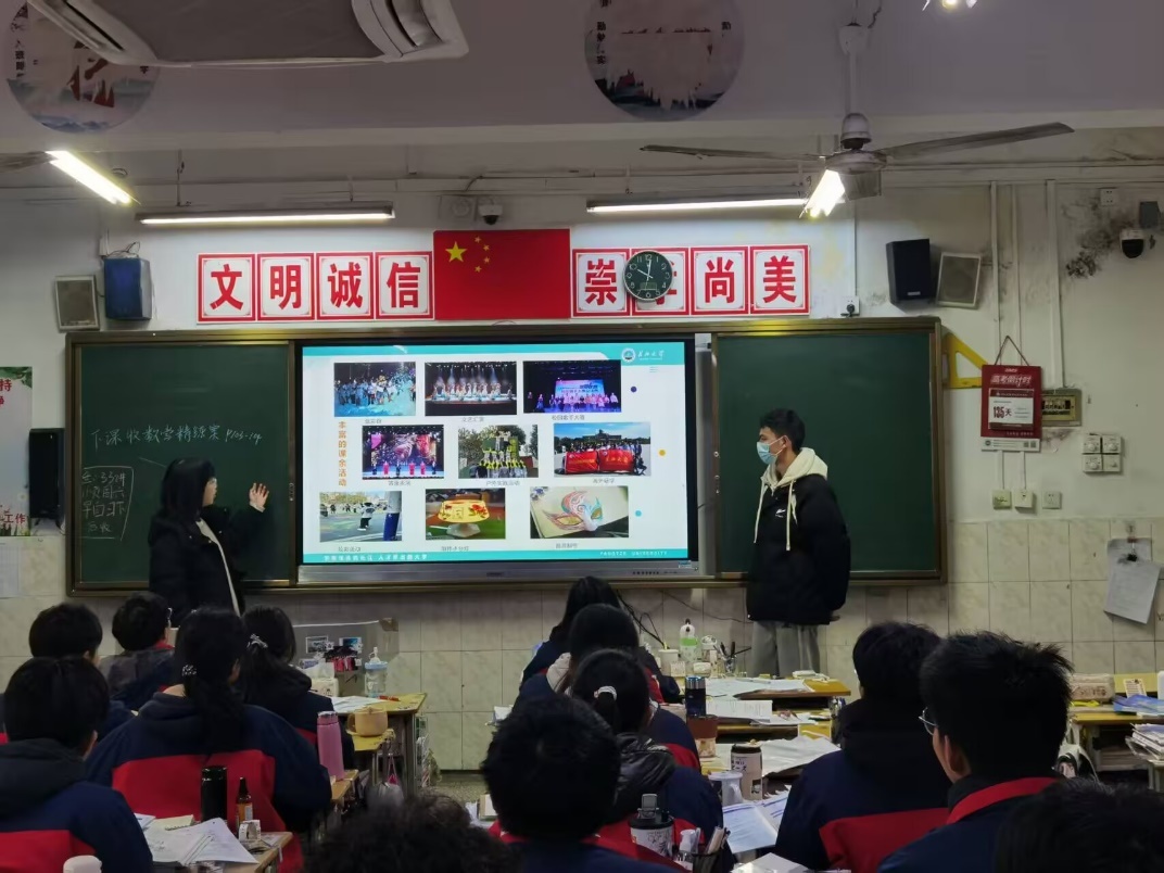 的特色专业、校园生活和社团活动等。在互动环节,同学们积极提问,问题主要集中在专业选择和高考复习方法上。程世聪和团队同学耐心一一解答。通过这次宣讲,他们向高三的学弟学妹们展示了丰富多彩的大学生活,解答了他们的疑问,让他们对西瓜视频
