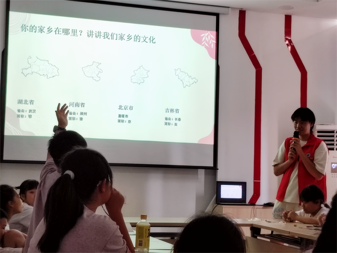 课堂上,张奕扬以“你的家乡在哪里”为切入点,通过提问“家乡文化”“家乡美食”激发孩子们的热情,自然过渡到课堂主题:“大家知道与我国传统节日相关的美食有哪些呢?”孩子们争先恐后地举手回答说:“中秋节吃月饼,端午节吃粽子”等等,在孩子们热情地回答中,大家渐渐对美食的起源产生了极大的兴趣。他为大家普及了古代食材的地域特色,又将美食特色与地域文化相关联,使小朋友们深刻领悟到美食文化背后的内涵。