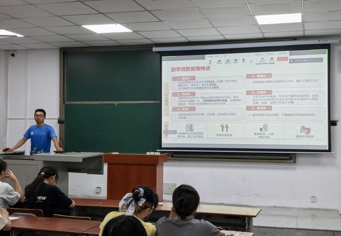杜子萱和范秀武同学详细介绍学校及学院的奖助政策、学院临时困难补助的申领流程、勤工助学岗位类型和酬劳标准,加深同学们对资助政策的认识,鼓励家庭经济困难等有需求的同学主动了解。