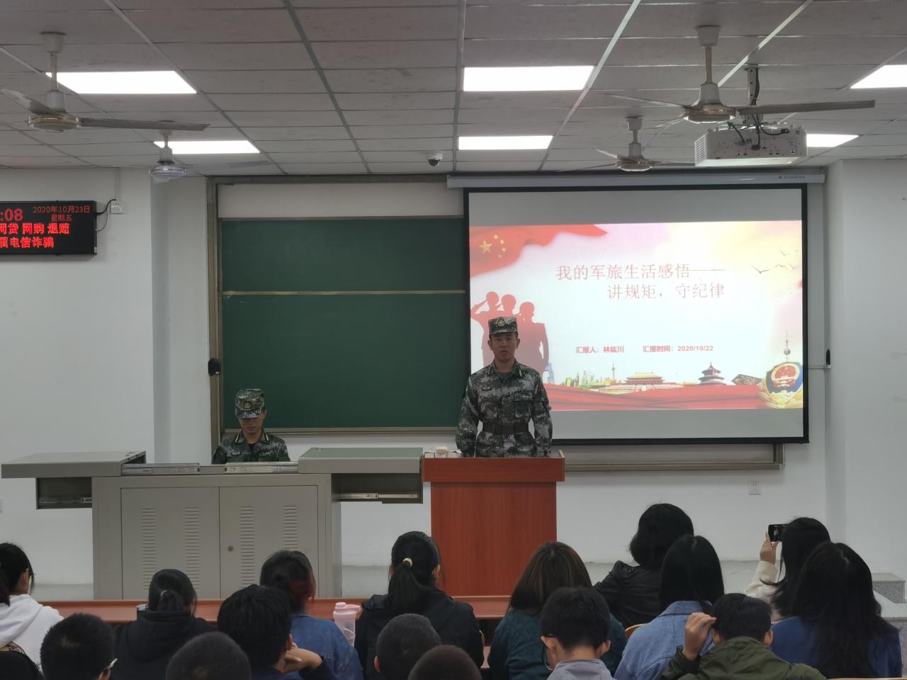 邀请从海军陆战队退伍的地信21701班林竑川同学于10月23日在武教B-106举行了以“讲规矩,守纪律”为主题的军旅生活分享会。党委副书记任倩老师、辅导员郭霖老师,地信22001和地信22002班全体同学参加了本次活动。