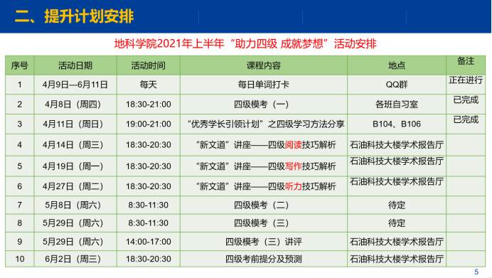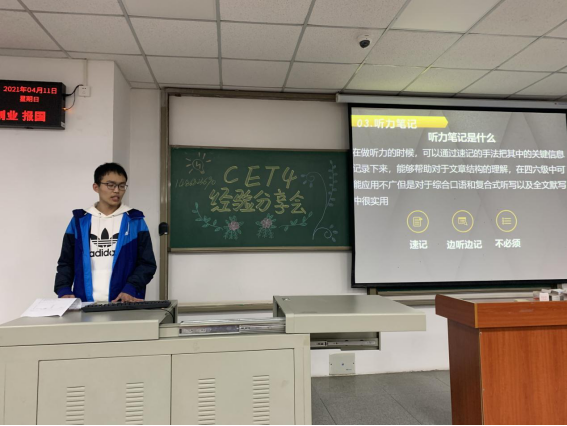 于4月11日晚19时分别在武教B-104和B-106教室举行了“2020级四级动员大会”。大会包括模考情况分析、提升计划安排和“学长学姐引领计划”之四级学习方法分享三个方面的内容,西瓜视频