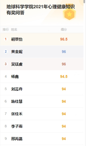 活动分线上线下两个阶段进行,共有398名同学参与线上心理健康有奖知识问答。测试前为引导同学们积极参与、学习相关知识,学院为得分前一百名的同学准备了奖品,并向各班心理委员发放《心理骨干工作指南》,请他们带头学习。测试成绩显示,新生平均得分为82.5,总体认知水平较好,对于“不良情绪可能引发生理疾病”、“运动能提高人的记忆力、创造力和活力”等有普遍共识,正确率在99%以上。但在“饮酒是否促进睡眠”、“患抑郁症可以自己判断药量”等题目上,错误率超过60%。为此在测试后,学院通过编写系列推送,在地科UpFlow公众号上进行科普,帮助同学们进一步扫清盲区和误解。