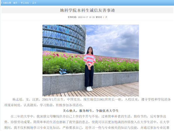 积极开展“诚实做人、诚信治学、诚信就业”的先进典型评选工作,在各年级积极组织优秀学生进行申报,选拔出杨孟瑶等4名同学为代表的诚信友善典型,通过学院官网进行广泛宣传, 引导广大学生理性消费、珍视诚信、勤奋有为,营造人人讲诚信、崇尚诚信、友善关爱的育人氛围。