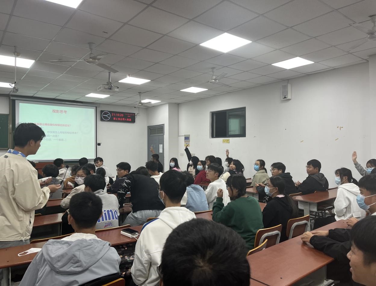 “测一测你的emo指数是多少?”活动伊始,王老师用心理测验,吸引了在场每个同学的注意,大家份份拿起手机参与。随后,王老师解释了测试得分,提醒同学们测验结果仅供参考,切勿“对号入座”,并提出四个观影思考题,引导大家用心观看。