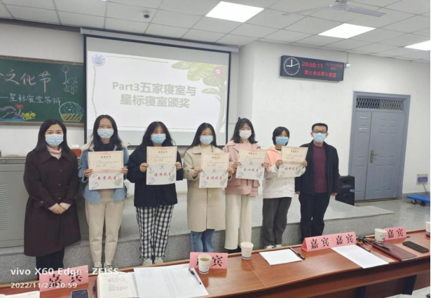 紧接着活动来到了最激动人心的环节,经过评委们深思熟虑的考量和公平公正的评判,从22个寝室的竞争当中,五个“星标寝室”脱颖而出。分别是书香之星——校内四栋352;洁净之星——校内四栋232;爱心之家——校内四栋212;乐雅之星——校内四栋649;持律之星——校内四栋302。黄瑱老师和姚佳老师为五家寝室与五星寝室颁奖并合影留念。