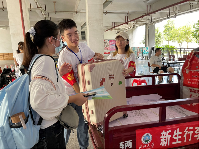 秋风送爽到九月,又是一年迎新时。因校园疫情防控,校外人员一律不能进校园,如何帮新生搬运行李成了亟待解决的难题。为此,学院各学生党支部的65名同学迅速响应,立刻组成党员先锋队,配合校区行李转运车,扎根寝室协助新生搬运行李,实现新生入住“一条龙”服务。9月4号上午是报道高峰期,37℃的骄阳挡不住学生党员为新生服务的热情与激情。汗水湿透了他们的衣衫,太阳晒红了他们的脸颊,但是他们依旧在坚持着,接完一个新生,马不停蹄地又去接下一个。女生衣物行李较多,常常需要“四对一”甚至“六对一”“八对一”服务。但大家没有叫苦喊累,而是主动服务,将新生的行李送到对应的寝室门前。测绘QX211班钟康说,“天气虽热,服务不能打折。一个党员就是一面旗帜,胸前的党徽,手臂上的红袖章,地科院的志愿者们就是开学季最美丽的风景线!”他们用自己的奉献不仅迎来了新生,也为学院打开了新局面。