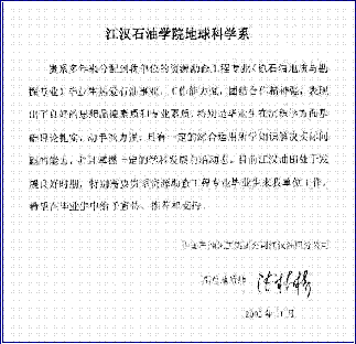 张柏桥(教授级高工、中国石油化工集团公司江汉油田分公司副总地质师): 贵系多年来分配到我单位的资源勘查工程专业 ( 原石油地质与勘探专业 ) 毕业生热爱石油事业,工作能力强,团结合作精神强,表现出了良好的思想品德素质和专业素质, 特别是毕业生在沉积学方面基础论扎实,动手能力强,只有一定的综合运用所学知识解决实际问题的能力,并且掌握 — 定的学科前沿发展动态。 目前江汉油田处于发展良好时期,特别需要贵系资源勘查工程专业毕业生来我单位工作,希望在毕业生中给予宣传、推荐和支持。 ( 详细内容 ) |