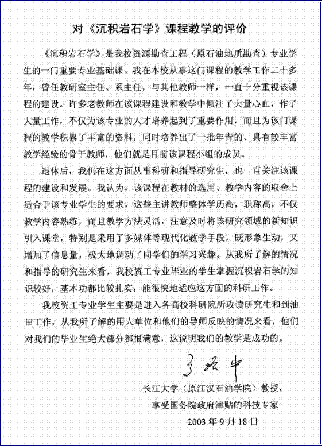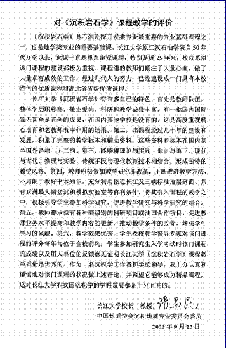 教授 、享受国务院政府特殊津贴的科技专家): 该课程在教材的选用、教学内容的取舍上适合于该专业学生的要求,这些主讲教师整体学历高,职称高,不仅教学内容熟练,而且教学方法灵活,注意 及时将该研究领域的新知识引入课堂, 特别是采用了多媒体等现代化教学手段,既形象生动,又增加了信息量,极大地调动了同学们的学习兴趣。 从我所了解的情况和指导的研究生来看,我校资工专业毕业的学生掌握沉积岩石学的知识较好,基本功都比较扎实,能很快地适应这方面的科研工作。( 详细内容) |