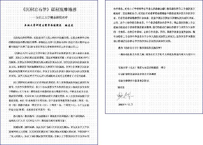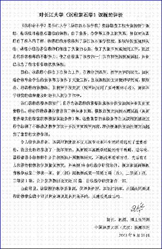 各级领导的大力支持,从实验室的建设到三峡地质标本长廊区的组建,学校均给予了很大的投入,保证了课程精品教学的需要,也展示了学校领导以学生为中心的办学理念,更显示了学校领导百年育人的高瞻远瞩!精品课程的第二个成就原因就是有一支优秀的队伍, … ;精品课程的第三个造就原因就是这个群体的高度敬业精神, … 。第四, 教学效果是明显的,每年该校资工专业本科毕业生有不少考入我校攻读硕士研究生,这些学生所掌握的知识特别是沉积岩石学方面的知识是比较系统和扎实的。( 详细内容) |