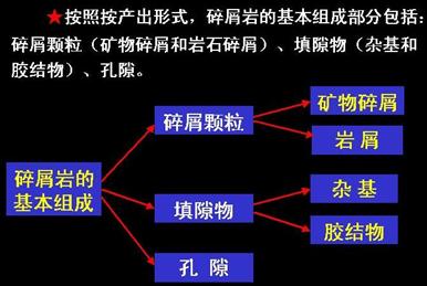 2. 按产出形式,碎屑岩的基本组成部分包括:碎屑颗粒(矿物碎屑和岩石碎屑)、填隙物(杂基和胶结物)、孔隙。