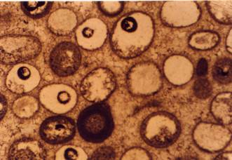 亮晶鲕粒灰岩,淡水选择性溶解形成粒内溶孔,飞仙关组,单偏光,4×10