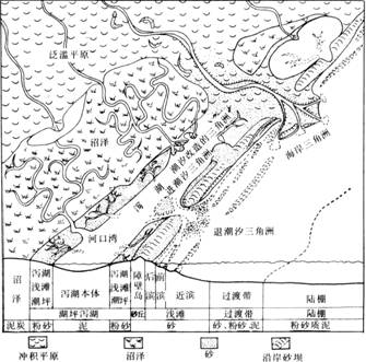 泻湖、障壁岛、潮坪、河口湾沉积环境示意图