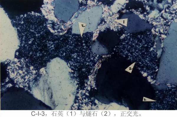 C—I—1:①颗粒:石英(有再生加大现象)、燧石、粘土岩岩屑。②杂基成分:粘土矿物,少量细粉砂级的石英碎屑。③胶结物成分:以硅质为主,有少量铁质,硅质已重结晶为显晶质石英,使石英碎屑颗粒再生加大;铁质成为石英碎屑颗粒的周边。④胶结类型:孔隙式胶结。