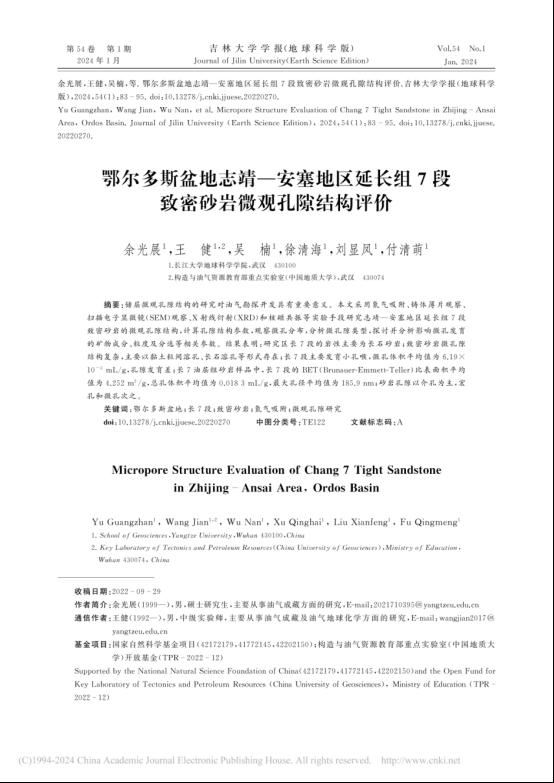 西瓜视频 硕士生余光展在《吉林大学学报(地球科学版)》上发表题为“鄂尔多斯盆地志靖—安塞地区延长组7段致密砂岩微观孔隙结构评价”的研究论文。西瓜视频 为论文第一署名单位,硕士生余光展为论文第一作者,教师王健为通讯作者。