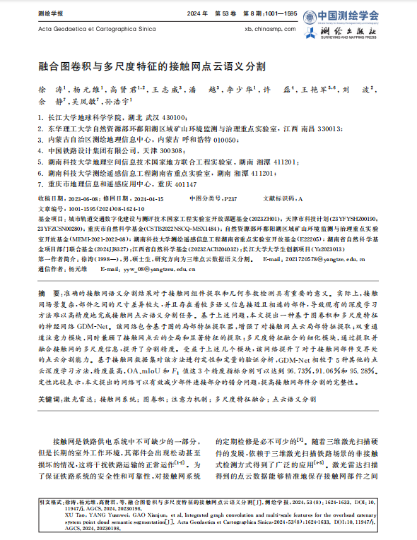 西瓜视频 硕士生徐涛在测绘领域主流期刊《测绘学报》上发表题为“融合图卷积与多尺度特征的接触网点云语义分割”的研究论文。