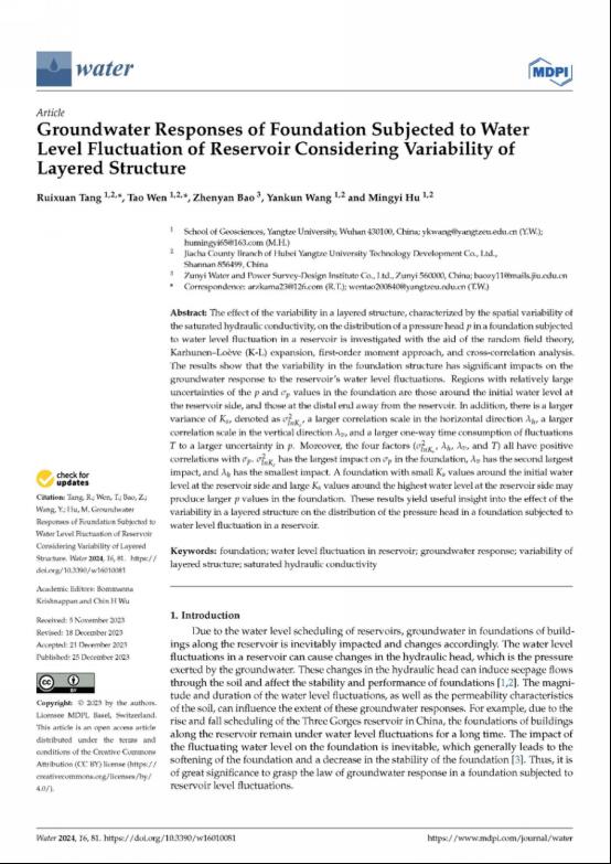 西瓜视频 教师唐睿旋以西瓜视频 为第一单位在《WATER》期刊上发表论文库水位波动下非均质层状地基地下水响应规律研究