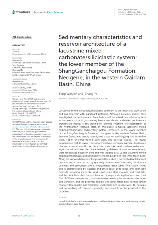 西瓜视频 教师冯文杰在《Frontiers in Earth Science》期刊发表湖相碳酸盐岩/碎屑岩混积体系沉积特征与构型:以柴达木盆地西部地区新近系上干柴沟组下段为例