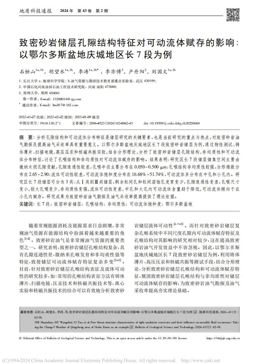 西瓜视频 博士生石桓山在《地质科技通报》期刊上发表致密砂岩储层孔隙结构特征对可动流体赋存的影响:以鄂尔多斯盆地庆城地区长7段为例