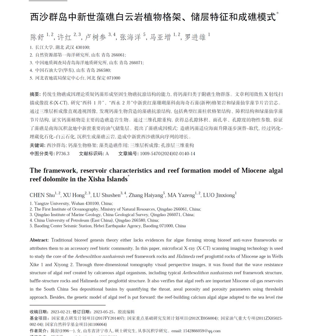硕士研究生陈舒在《热带海洋学报》期刊上发表题为“西沙群岛中新世藻礁白云岩植物格架、储层特征和成礁模式”的研究论文。该论文利用微焦X射线扫描成像技术(X-CT),研究“西科1井”、“西永2井”中新世红藻珊瑚藻科南海奇石藻(新种)格架岩和绿藻仙掌藻节片岩岩芯。通过三维层析成像直观透视图像,发现钙藻生物营造的藻礁抗浪结构,包括典型红藻柱状格架结构、障积结构和绿藻仙掌藻节片结构,证实钙藻植物是主要的造礁造岩生物。通过三维孔隙重构,获得总孔隙体积、面孔率、孔隙度的物性参数,验证了藻礁是南海沉积盆地中新世重要的油气储集层。提出了藻礁成因模式:造礁钙藻适应海面升降逐步演替–取代,经过钙化–埋藏化石化–白云石化,沉积生成藻礁云岩,造成中新世西沙礁纵向序列的增长。