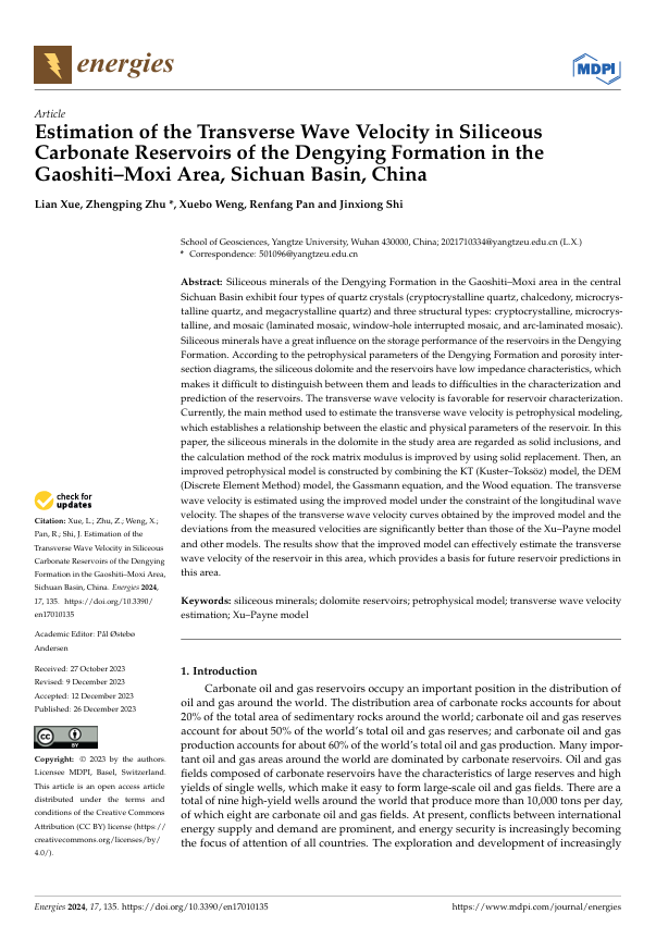 地科系朱正平博士在地质能源领域主流期刊《Energies》上发表题为“Estimation of the Transverse Wave Velocity in Siliceous Carbonate Reservoirs of the Dengying Formation in the Gaoshiti–Moxi Area, Sichuan Basin, China”的研究论文。
