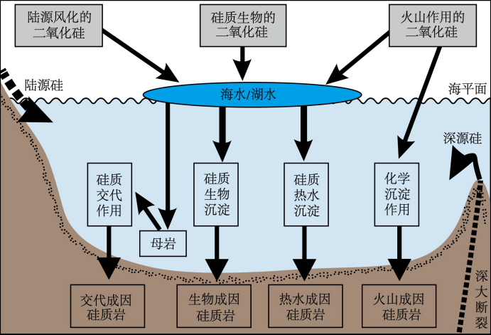 硅质岩作为地球表层广泛分布的富硅沉积岩,其成因长期困扰地质学界。传统方法难以准确区分其硅质来源与形成环境。硅同位素(Si同位素)作为直接示踪工具,可有效解析硅质岩的成因类型,包括热液成因、火山成因、生物成因和交代成因四大类(图2)。通过高精度测试技术(如多接收电感耦合等离子质谱法MC-ICP-MS和二次离子质谱法SIMS),目前已实现了硅同位素分析的突破性进展,精度分别达到±0.10‰和±0.10‰~±0.22‰,为追踪硅质迁移与沉积演化提供了可靠手段。