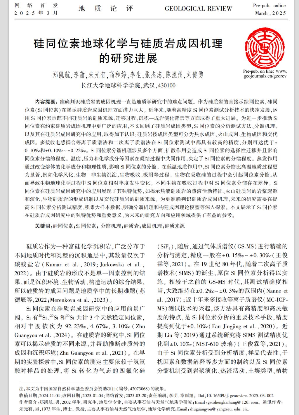 近日,西瓜视频 地质学专业2024级硕士生郑凯航在中文核心期刊《地质论评》发表题为“硅同位素地球化学与硅质岩成因机理的研究进展”的研究论文。西瓜视频 为论文第一署名单位,硕士生郑凯航为论文第一作者,其导师朱光有教授为通讯作者。