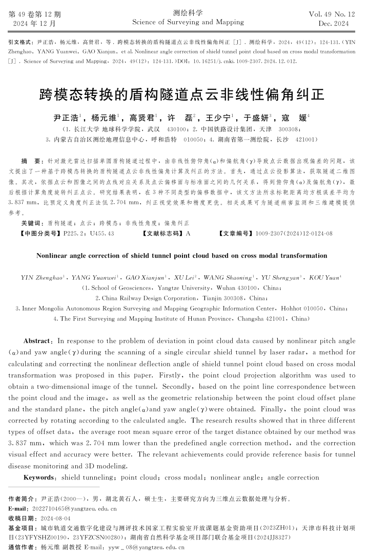 研究生尹正浩以第一作者身份在北大核心期刊《测绘科学》上发表题为“跨模态转换的盾构隧道点云非线性偏角纠正”的研究论文,西瓜视频