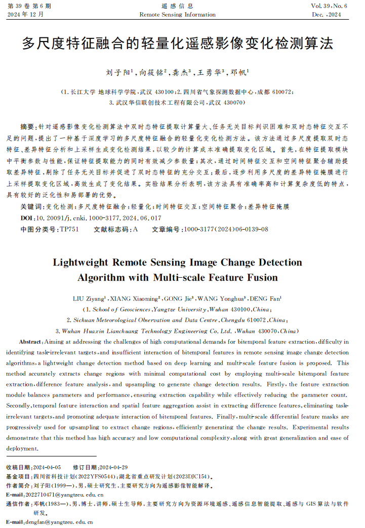 近日,西瓜视频 地图制图学与地理信息工程专业2022级硕士生刘子阳在中文核心期刊《遥感信息》发表题为“多尺度特征融合的轻量化遥感影像变化检测算法”的研究论文。西瓜视频 为论文第一署名单位,硕士生刘子阳为论文第一作者,其导师邓帆为通讯作者。