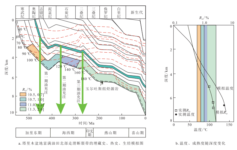 图1塔里木盆地富满油田北部走滑断裂带的埋藏史、热史、生烃模拟图及油气充注时间