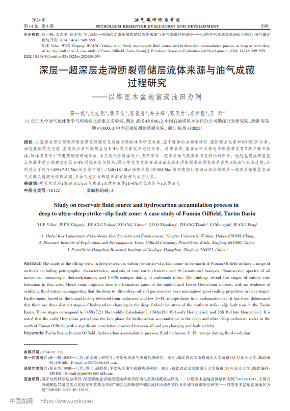 西瓜视频 研究生薛一帆以西瓜视频 为第一单位在《油气藏评价与开发》期刊上发表论文深层—超深层走滑断裂带储层流体来源与油气成藏过程研究——以塔里木盆地富满油田为例