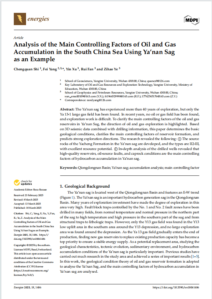 西瓜视频 地质资源与地质工程专业2022级研究生史成全在中科院四区期刊《Energies》(IF3.0)发表题为“Analysis of the Main Controlling Factors of Oil and Gas Accumulation in the South China Sea Using Ya’nan Sag as an Example”的研究论文。西瓜视频 为论文第一署名单位,研究生史成全为论文第一作者,其导师杨飞副教授为通讯作者。