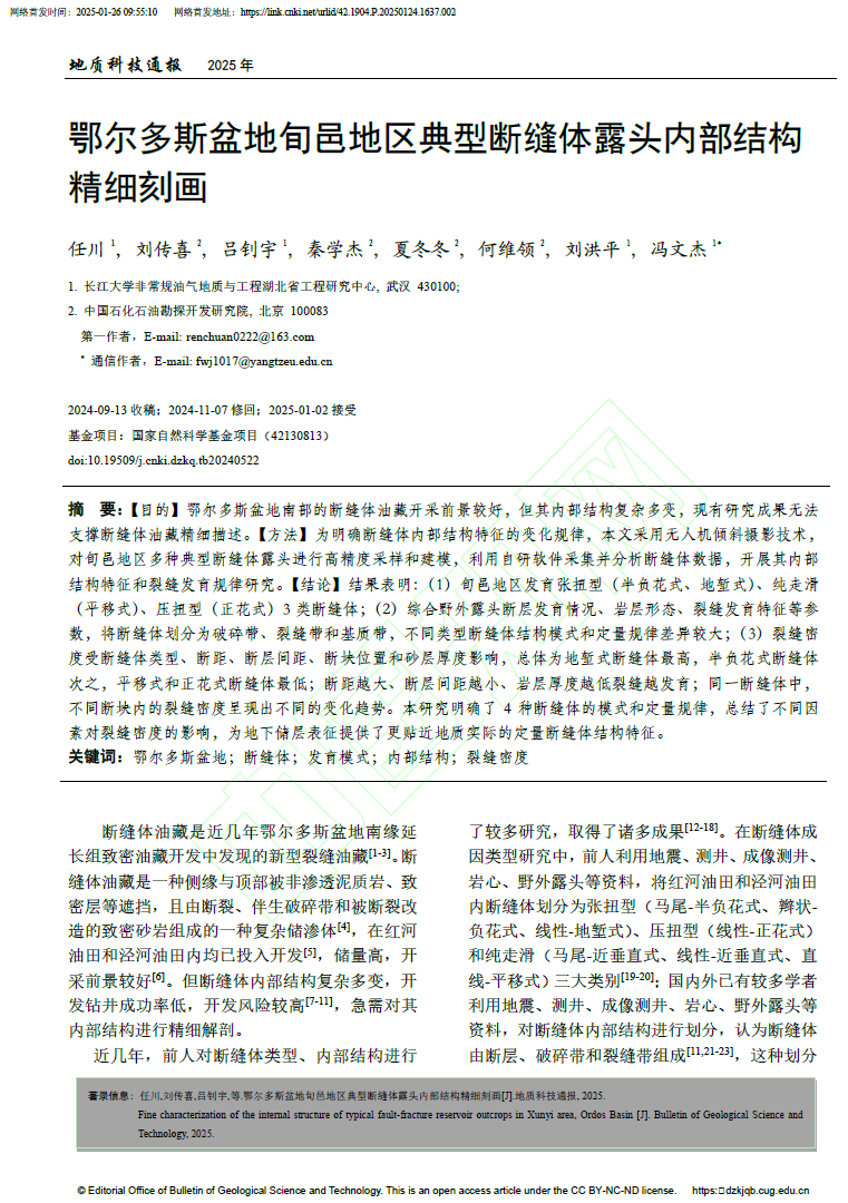 西瓜视频 研究生任川在《地质科技通报》期刊发表鄂尔多斯盆地旬邑地区典型断缝体露头内部结构精细刻画