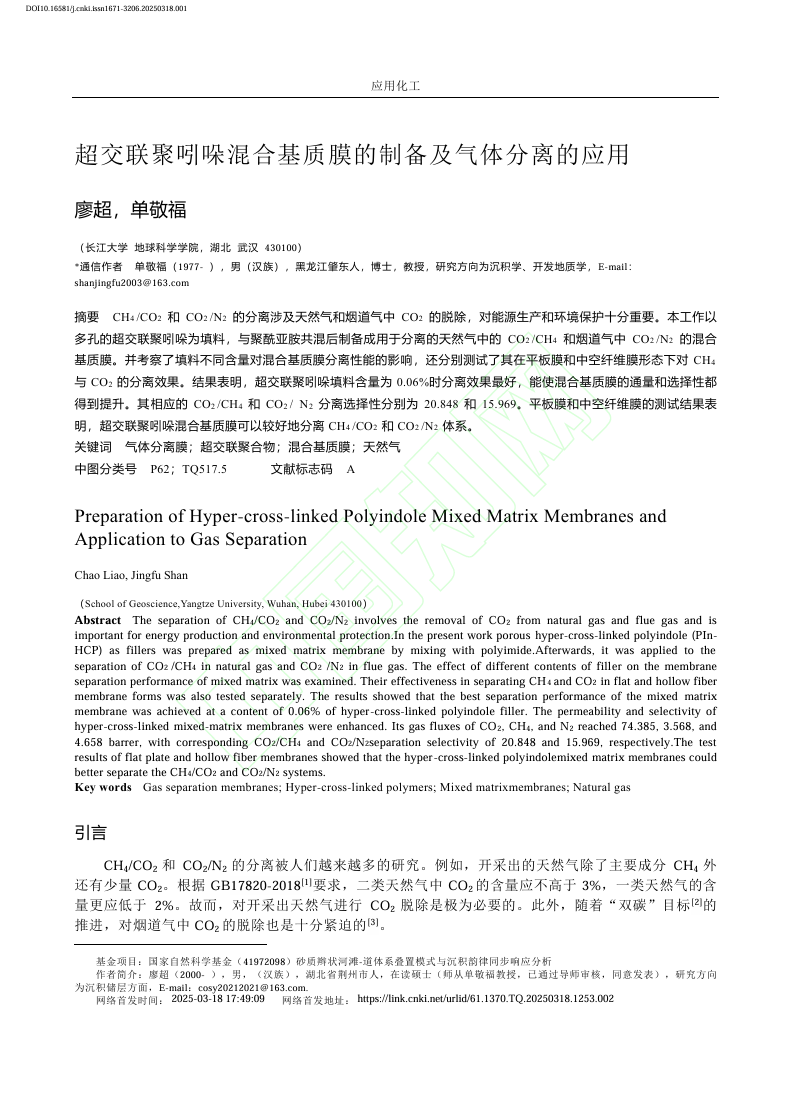 硕士生廖超在中文核心期刊《应用化工》上发表题为“超交联聚吲哚混合基质膜的制备及气体分离的应用”的研究论文。该论文以多孔的超交联聚吲哚为填料,与聚酰亚胺共混后制备成用于分离的天然气中的CO2/CH4和烟道气中CO2/N2的混合基质膜。西瓜视频
